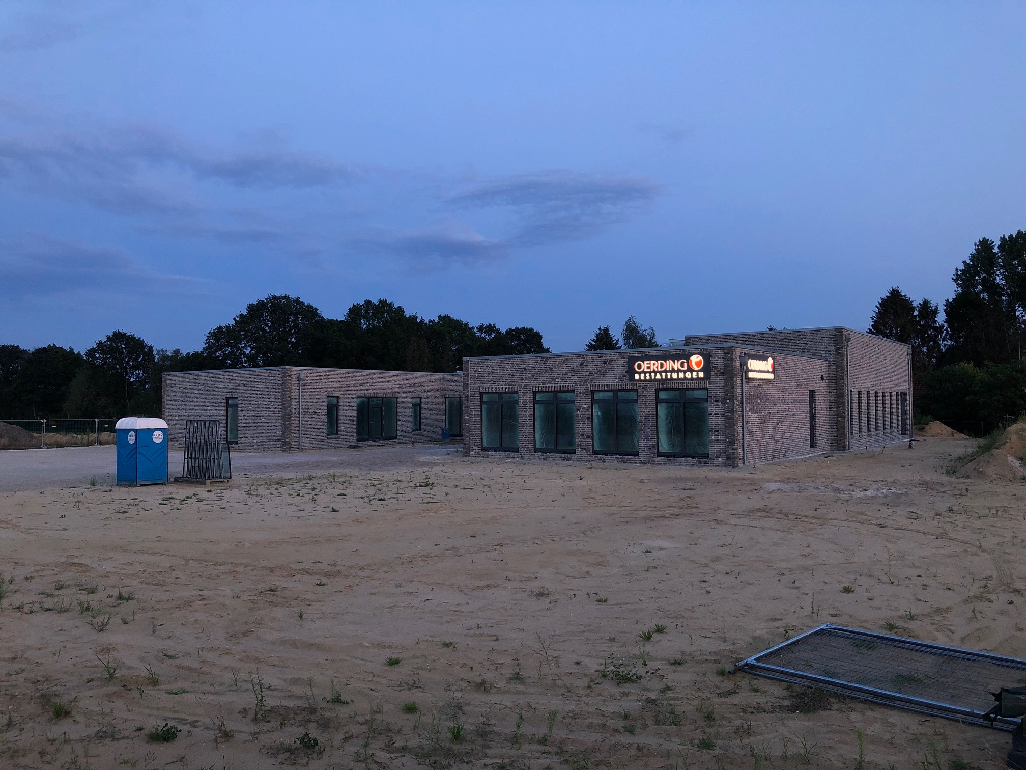 Am vergangenen Mittwoch wurde bereits das beleuchtete Firmenschild montiert.Jetzt wirkt das Gebäude irgendwie wie „geboren“.
