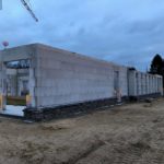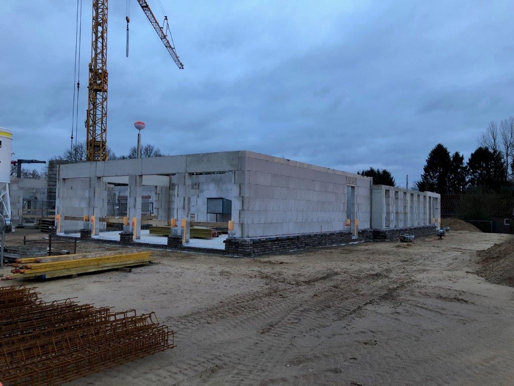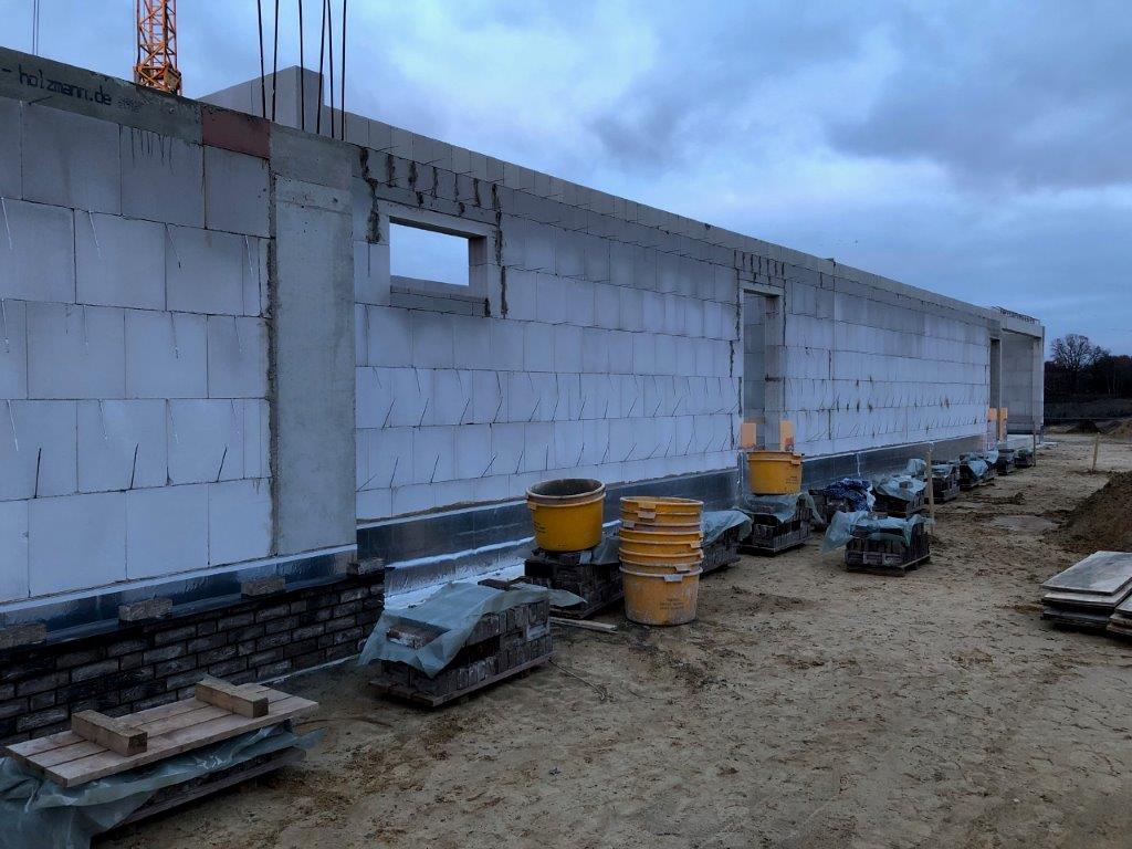 Seit dem 7. Januar haben die Maurer, nach ihrem Weihnachtsurlaub, planmäßig die Arbeit wieder aufgenommen.Im Gebäude werden die letzten Scheerwände fertig gestellt und außen kann man schon den ersten Verblender sehen.