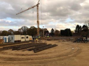 In diesen Tagen wir das Eisen, welches später für die Stabilität der Sohle sorgen soll, aufgetragen. Anders als es früher noch üblich war, wird es nicht mehr in einzelnen verschweißten Matten, sondern als Rollen, wie vorne im Bild zu sehen, wechselseitig aufgelegt. Die flachen, miteinander verschraubten Stahlbänder sind die Grundlage für eine spätere Blitzschutzanlage.